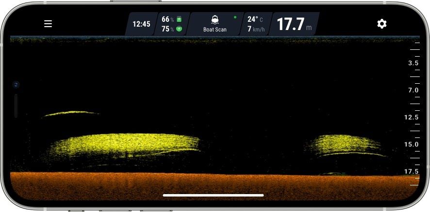 Second sonar return: You may also see a second sonar return: this is caused when the sonar signal bounces between the bottom and the surface of the water and back again. Hard bottoms will show a strong second return, while soft bottoms will show a very weak one or none at all. To properly determine the bottom hardness, please use Narrow or Mid beam angle on your Deeper. Wide beams are not suited to determine bottom hardness.