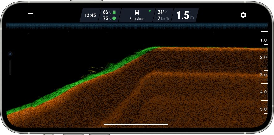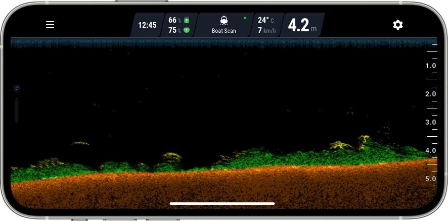 Bottom: When set to Raw (detailed) sonar display, your Deeper can help you determine whether the bottom is hard or soft. When the sonar pulses sent from your Deeper are reflected by the bottom, a hard bottom will return a stronger signal than a soft bottom. To properly determine the bottom hardness, please use Narrow or Mid beams on your Deeper. Wide beams are not suited to determine bottom hardness.