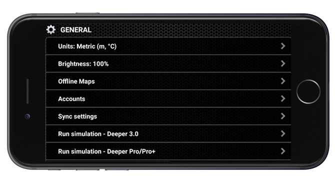 5. Simulacije, omogućava ili onemogućava način rada za demonstriranje aplikacije. To na glavnom zaslonu prikazuje informacije sa sonara kada uređaj Deeper nije povezan s vašim pametnim telefonom ili tabletom.