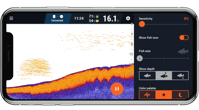 Paleta kolorów — pozwala wybrać najwygodniejszą paletę kolorów do przeglądania danych sonaru w oparciu o środowisko, warunki i porę dnia, w którym łowisz. Oprócz klasycznej palety kolorów dostępne są dwie inne opcje — Dzień i Noc — których można używać do najlepszego wyświetlania odczytów sonaru w jasnych warunkach słonecznych (tryb dzienny) lub przy słabym oświetleniu (tryb nocny). To ustawienie nie jest dostępne dla Deeper START