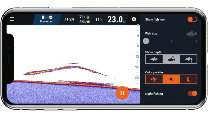 Tryb nocny powinien być włączony podczas łowienia w nocy lub w warunkach słabego oświetlenia. Dzięki Deeper START można go aktywować natychmiast, podczas gdy w przypadku modeli Deeper PRO, PRO+ i CHIRP należy najpierw wymienić standardowe pokrowiec na pokrowiec Deeper Night Fishing Cover. Tryb nocny aktywuje migające światło, które jest widoczne tylko przez przezroczystą osłonę.