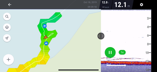 - Skenavimo metu. Norėdami pažymėti vietą ar laimikį skenavimo metu, paspauskite ekrano apačios kairėje pusėje esantį pliuso simbolį ir pasirinkite vieną iš žymių: Išsaugoti vietą arba Išsaugoti laimikį. Tuomet pirštu žymę nukreipkite ant norimos vietos žemėlapyje – ir norima vietovė išsaugota.