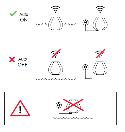 Der Deeper START verfügt über keine Ein/Aus-Taste: er schaltet sich automatisch ein, sobald er unter Wasser gehalten oder an eine Stromquelle angeschlossen wird. Wenn der Fischfinder keinen Kontakt mit Wasser hat oder geladen wird, schaltet er sich ab, um Batterielaufzeit zu sparen.