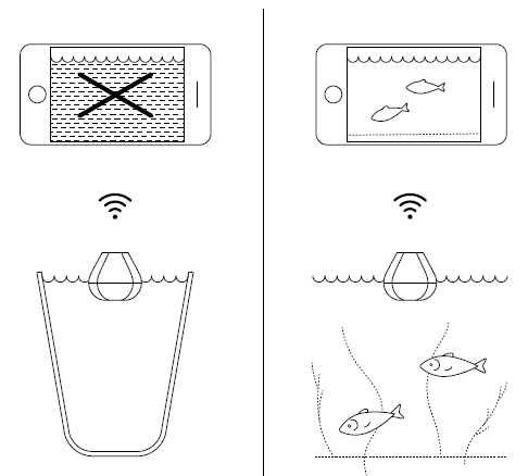 Wenn Sie Ihren Deeper START zu Hause in ein Aquarium, einen Becher, einen Eimer, in die Badewanne oder einen ähnlichen Behälter halten, können Sie das Gerät einschalten, um es mit Ihrem Mobilgerät zu koppeln. Höchstwahrscheinlich wird das Gerät jedoch nicht in der Lage sein, richtig zu scannen – daher wird Ihnen wahrscheinlich lediglich ein leerer Bildschirm angezeigt mitsamt der Statusmeldung: Zu flach oder zu tief.