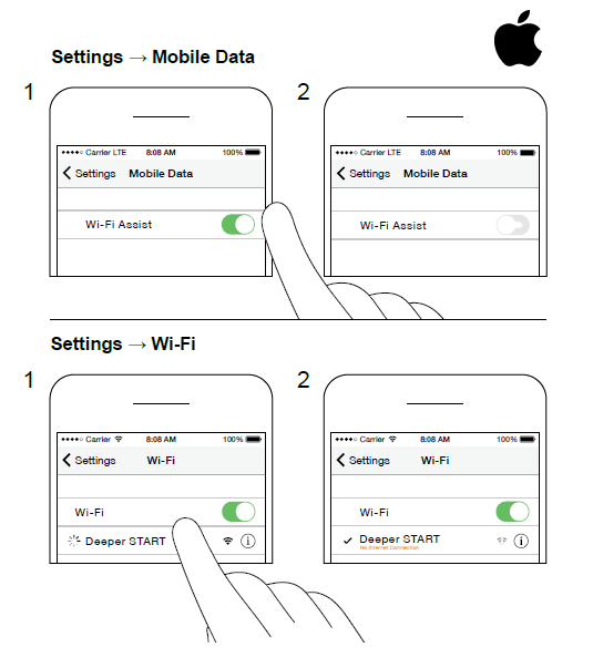 Ihr Deeper START ist nun mit Ihrem iPhone oder iPad verbunden - eventuell wird Keine Internetverbindung eingeblendet. Keine Sorge, das ist ganz normal. Es bedeutet einfach, dass die Wi-Fi-Verbindung Ihres Mobilgeräts jetzt für Ihren Deeper START und nicht für das Internet verwendet wird.