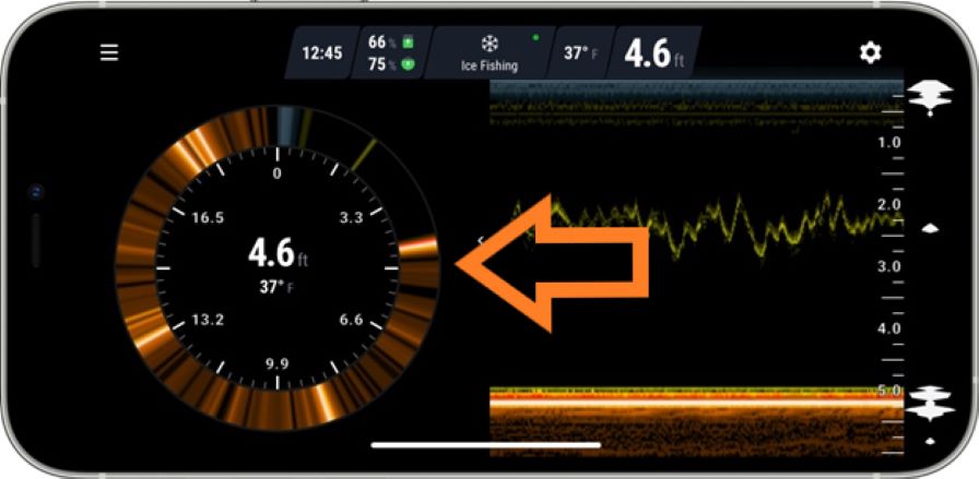 - Traditional Circular Flasher: This display is exactly like a traditional ice flasher. In the center you will see the depth and surface water temperature displayed. Around the side is the actual flasher. At the very top, you will see a band of blue/grey color – this is the ice itself. Then follow the display clockwise until you see a brown/orange band of color – this is the bottom. Anything displayed in between the ice and the bottom will be either your lure or a fish. These will show as bands of green/yellow color.