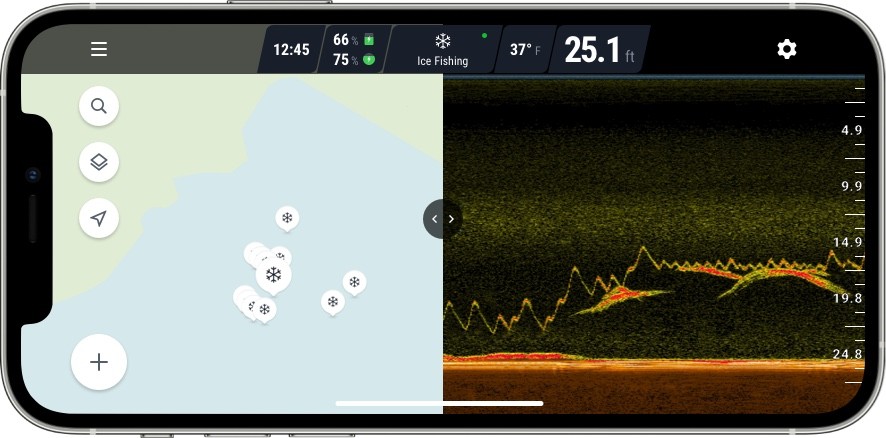 The Ice Fishing display also has a mapping function (to ensure this function works, make sure are a registered user and have downloaded the Offline Maps for your state or country). You will see a map icon on the left-hand side of the display. If you click this, a map will open showing your current location. When you drop your Deeper into an ice hole, that location will automatically be marked onto your map and saved. As you fish more ice holes, these will also be added to your map. If you click on one of these locations, it will automatically show you the depth at that spot.