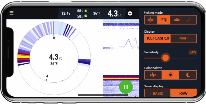 Ekran wędkowania pod lodem dostępny w aplikacji Deeper oferuje szereg opcji lokalizowania ryb, śledzenia przynęty i obserwowania reakcji ryb. Po lewej stronie znajduje się tradycyjny flasher kołowy, między środkiem a prawą stroną — ekran echosondy, a po prawej stronie — flasher słupkowy.