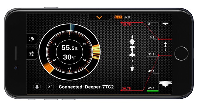Екранът за риболов на лед на приложението Deeper App ви дава няколко начина да откривате риба, да следите стръвта си и да гледате как рибата реагира на вашите действия. От лявата страна е традиционният дисплей с кръгова диаграма, в средната част е дисплеят на сонара, а в крайната дясна част е вертикалната диаграма.