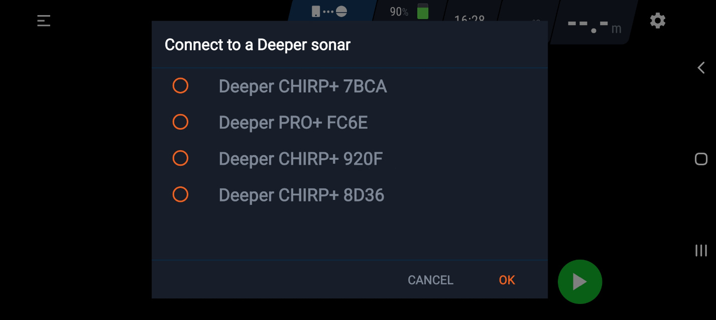 Deeperソナーと接続するときにはこのボタンを押してください(Deeperが水に触れるか、電源に接続して起動していることが必要です)。