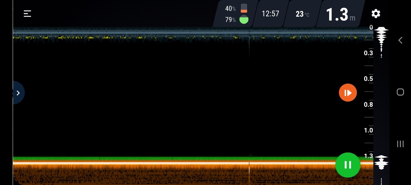 Deeperソナーがスマートフォンに接続され、スキャンしているときに、画面を押して左にスライドさせることでいつでも巻き戻すことができます。何かを見逃したり、少し前のスキャンを見たいときに役立つ機能です。