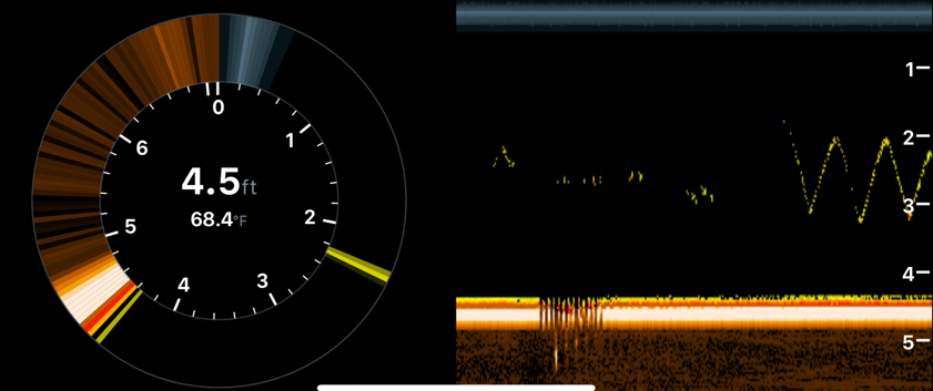 - Circular flasher (flasher view). Shows real-time returns in a rotating, color-coded ring - green/yellow for your lure or bait, red/orange for the bottom, and green/yellow for fish.