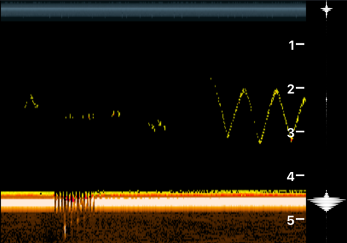 Any lure, jig, or fish will appear as moving white bands between the ice and the bottom.