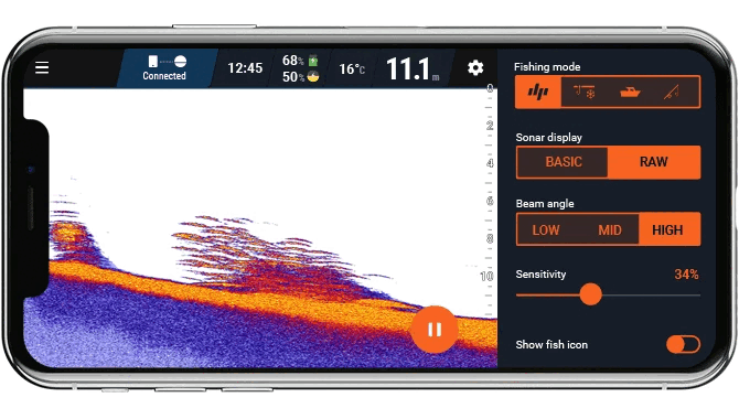 右上のギアマークをクリックするとソナーセッティングの画面にアクセスできます。新しいメニューが開き、それぞれのDeeperのモデルで調整可能な設定が表示されます。右にスライドすることで、いつでもメニューを閉じることができます。