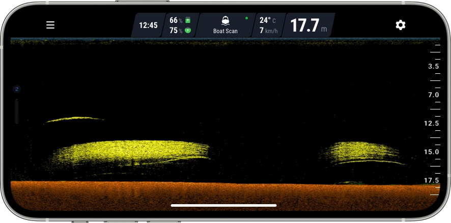 Deuxième retour sonar : Vous pouvez également voir un deuxième retour sonar : il est causé par le rebond du signal sonar entre le fond et la surface de l'eau, et inversement. Les fonds durs présenteront un second retour fort, tandis que les fonds mous en présenteront un très faible ou aucun. Pour déterminer correctement la dureté du fond, veuillez utiliser un angle de faisceau Étroit ou Moyen sur votre Deeper. Les faisceaux Large ne sont pas adaptés pour déterminer la dureté du fond.