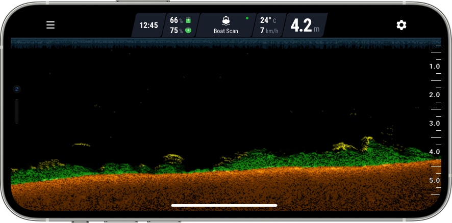 Fond : Lorsqu'il est réglé sur l'affichage sonar Détaillé, votre Deeper peut vous aider à déterminer si le fond est dur ou mou. Lorsque les impulsions sonar envoyées par votre Deeper sont réfléchies par le fond, un fond dur renverra un signal plus fort qu'un fond mou. Pour déterminer correctement la dureté du fond, veuillez utiliser les faisceaux Étroit ou Moyen sur votre Deeper. Les faisceaux Large ne sont pas adaptés pour déterminer la dureté du fond.