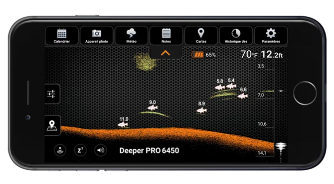 Il cono largo (90 kHz) avrà un disturbo superficiale di 1.3metri, e non troverà nessun pesce o struttra in questa zona. Il Deeper segnalerà con un messaggio di errore “troppo bassa o troppo profonda” se la profndità sarà minore di 1.3metri.