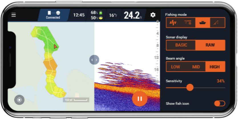 The Fish Deeper app uses the GPS in your smartphone or tablet to create bathymetric (underwater contour) maps as you troll. For this function, select boat mode (Settings > Boat mode). You will get a split screen display showing both your mapping and your sonar readings.